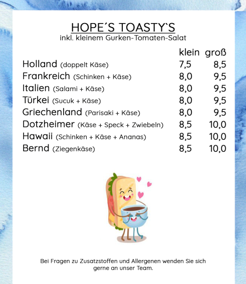 Welcome to Café Hope`s, a delightful café located in the heart of Wiesbaden, Germany, at Dörrgasse 4a. This charming spot is more than just a café; it embodies a touching story that resonates with its name. As you step inside, you are greeted by a warm atmosphere complemented by exceptional service.